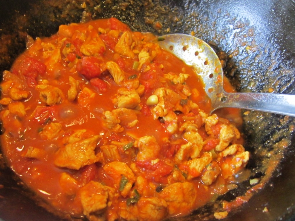 Ввожу курицу, обжариваю и добавляю томаты и чеснок.
