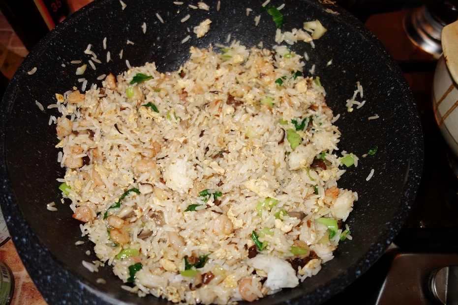 Далее добавляем рис, грибы, огурец, икру, соус из моллюсков, пак чой и обжариваем всю эту смесь до готовности. Затем добавляем рыбный соус и перчим