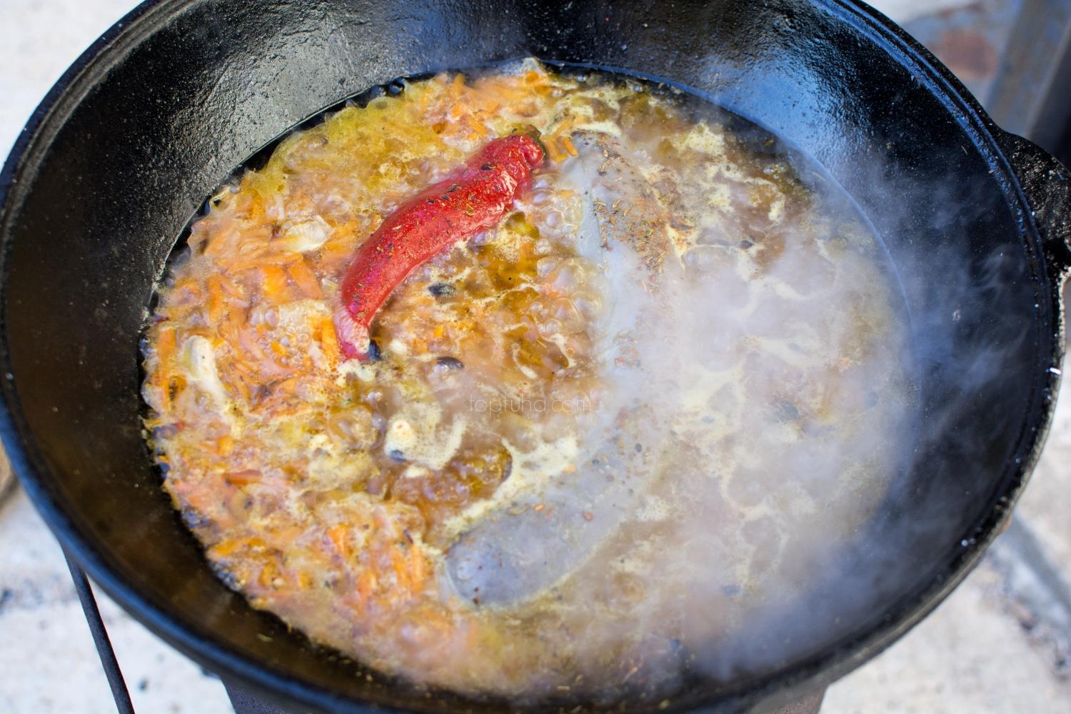 Аккуратно заливаем водой на 2 пальца и ждем чтоб закипело а потом ушло в рис. Пробуем перед рисом на соль и если мало до рис досаливаем по вкусу.