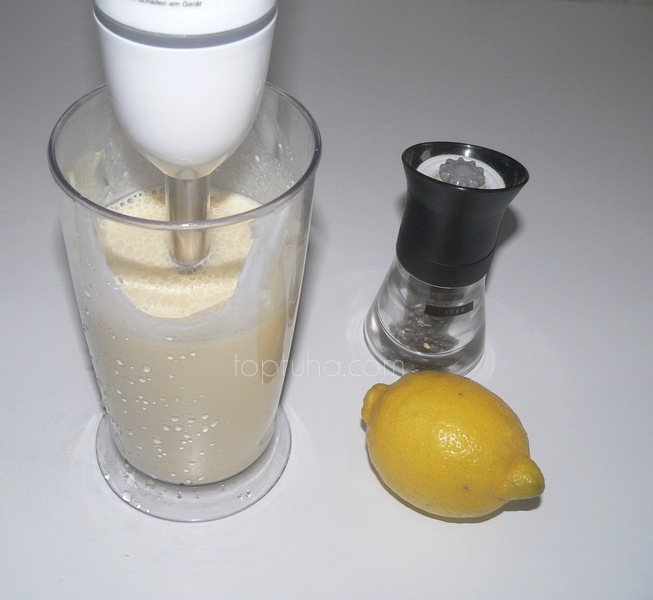 Смешиваем в блендере сметану, яйца, горчицу и хорошо взбиваем.