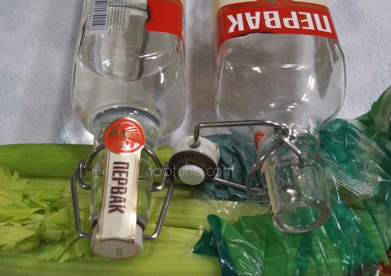 Собственно, нужна сама водка и сельдерей (ингредиенты раз и два). Ну и бутылка, в которой настаивать будем (она пустая, поэтому не считается).