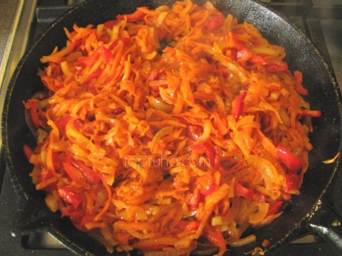 Сначала обжарила в 2 ст.л. постного масла томатную пасту, потом овощи до полуготовности