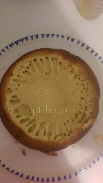 Ффторой бисквит готов — у него выросла шляпа. Я ее срезаю и обнаруживаю прикольные термитные ходы. От кашеобразного остывающего желе отделяю через салфетку миллилитров 150 жидкости.Что-то в топтуху решаю заглянуть: поворачиваюсь к остывающим коржам, а питомец понадкусывал бисквитную «шляпу» - хорошо она хоть отдельно лежала от слоев.