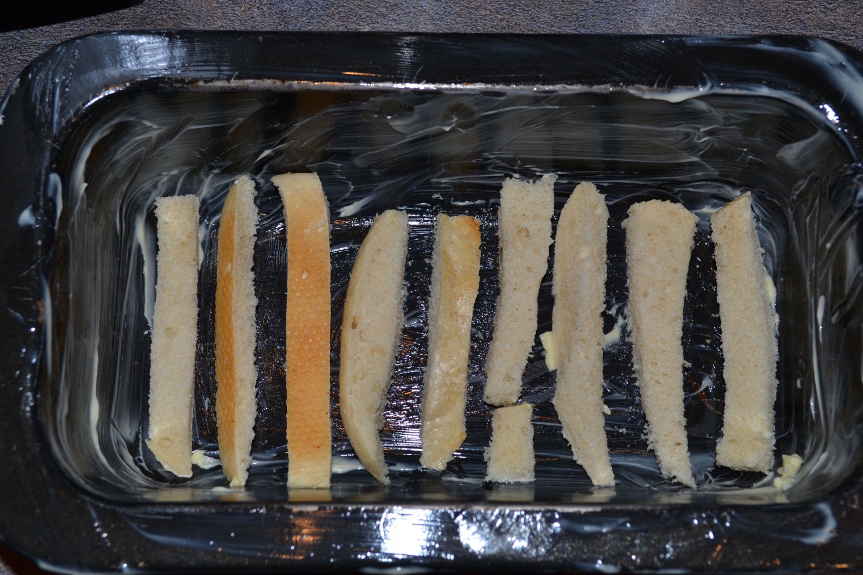Формочку для запекания, обильно и тщательно смазываем сливочным маслом. Дно выкладываем брусочками порезанной булочкой.