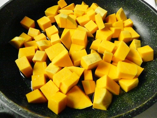 Тыкву чистим, режем на небольшие куски, и жарим, посолив-поперчив, на четверти стакана оливкового масла до готовности, т.е. когда будет легко протыкаться вилкой.