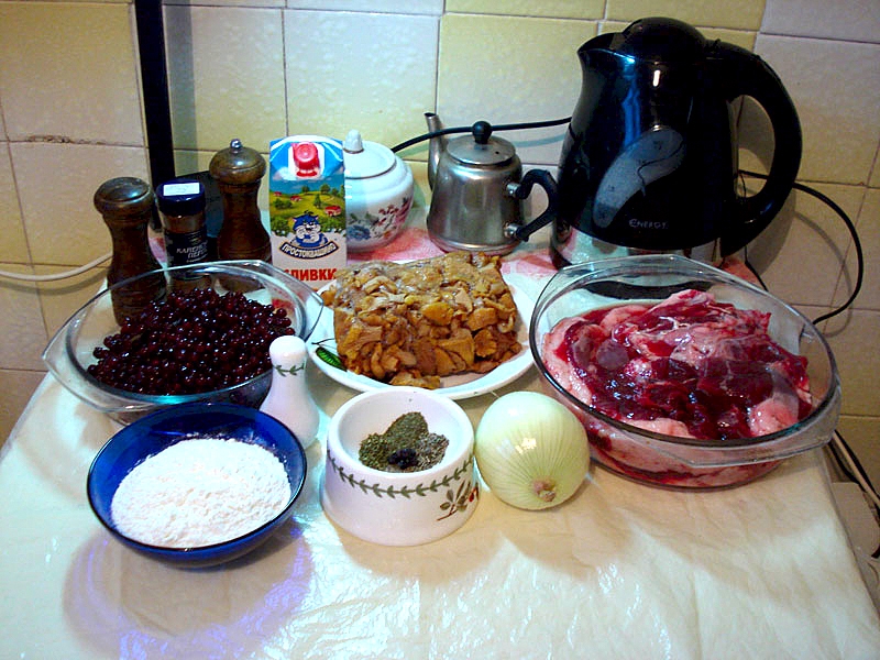 Итак, погнали. На 8 порций нам потребуется: бобр - 1,3 кг, брусника - грамм 200-300 (может поменьше, а может побольше. Я брала полкило, у меня ещё ягодка оставалась), сливки 20% - максимум полстакана, грибы - у меня были свежемороженные лисички (по весу не скажу, т.к. перед заморозкой не взвешивали), лук - 1 штучка, мука - стакан, может больше, вода - на глазок, соль, перец - по вкусу, специи - у меня были можжевельник, зира, укроп, петрушка.