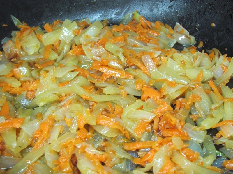 Овощи обжариваем: сначала лук, затем морковь, огурцы и кидаем специи.