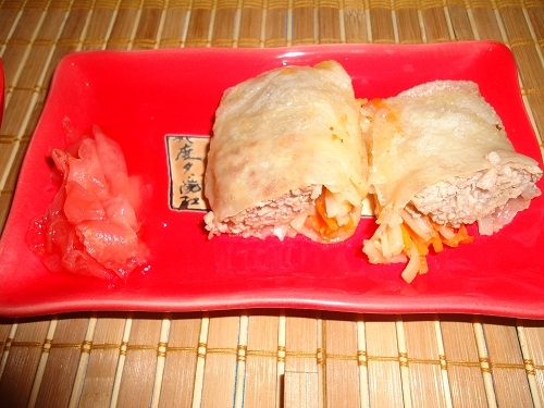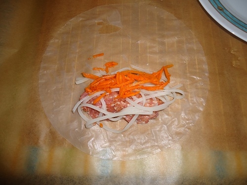 смачиваю быстро листик в воде и ложу начину: фарш, лапша предварительно запареная и морква нарезанная на терке для корейских ништяков